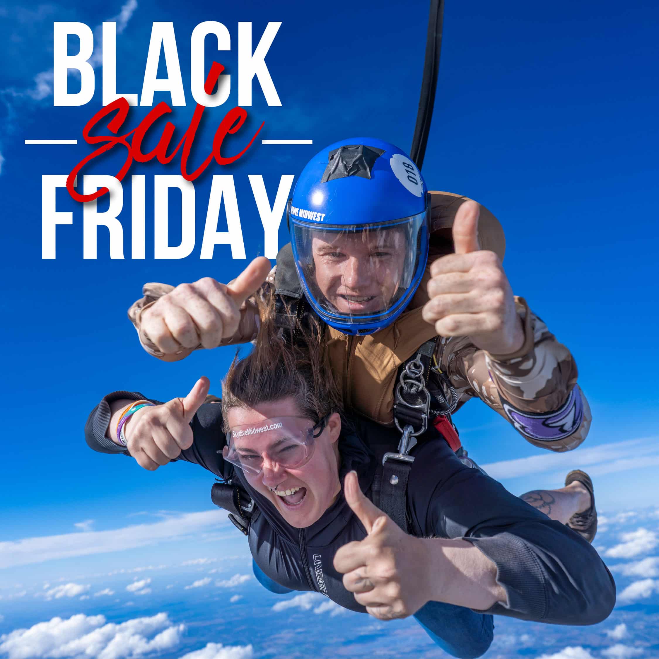 Black Friday Tandem Skydive & Premium Video & Photo Package. Prepay and save! Don’t miss out on $130 in savings, offer expires on Black Friday (November 28th). Simply purchase gift certificate and call 262-886-3480 to schedule your jump for the 2026 season when you’re ready.